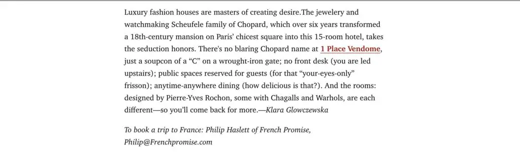 “Luxury fashion houses are masters of creating desire. The jewelery and watchmaking Scheufele family of Chopard, which over six years transformed a 18th-century mansion on Paris’ chicest square into this 15-room hotel, takes the seduction honors. There’s no blaring Chopard name at 1 Place Vendome, just a soupcon of a “C” on a wrought-iron gate; no front desk (you are led upstairs); public spaces reserved for guests (for that “your-eyes-only” frisson); anytime-anywhere dining (how delicious is that?). And the rooms: designed by Pierre-Yves Rochon, some with Chagalls and Warhols, are each different—so you’ll come back for more.”