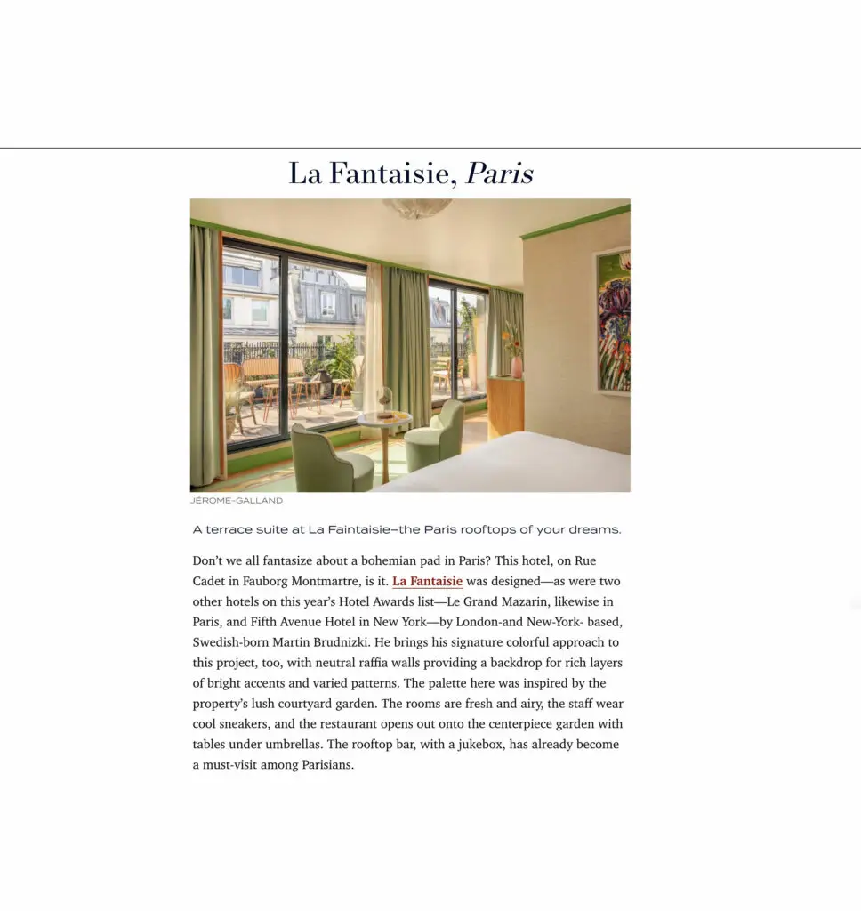 “Don’t we all fantasize about a bohemian pad in Paris? This hotel, on Rue Cadet in Fauborg Montmartre, is it. La Fantaisie was designed—as were two other hotels on this year’s Hotel Awards list—Le Grand Mazarin, likewise in Paris, and Fifth Avenue Hotel in New York—by London-and New-York- based, Swedish-born Martin Brudnizki. He brings his signature colorful approach to this project, too, with neutral raffia walls providing a backdrop for rich layers of bright accents and varied patterns. The palette here was inspired by the property’s lush courtyard garden. The rooms are fresh and airy, the staff wear cool sneakers, and the restaurant opens out onto the centerpiece garden with tables under umbrellas. The rooftop bar, with a jukebox, has already become a must-visit among Parisians.”